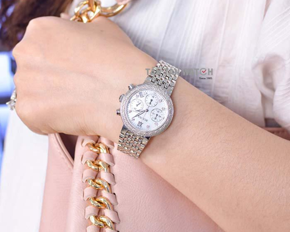 Khi chạm mắt vào Bulova 96W204, phái đẹp sẽ lập tức bị cuốn hút bởi vẻ đẹp thanh lịch và độc đáo của mặt số xà cừ màu trắng. Với chất liệu này, mỗi mặt số sẽ là một phiên bản độc lập. Các vân xà cừ tạo nên hiệu ứng chuyển sáng huyền ảo, giúp đồng hồ thêm phần thu hút và rạng rỡ. Trung tâm mặt số là bộ kim hình lá có thiết kế nhẹ nhàng, uyển chuyển và mềm mại, giúp tổng thể trở nên nhẹ nhàng và hài hòa hơn. Cùng với đó là 3 mặt số phụ nổi bật hỗ trợ chức năng bấm giờ Chronograph được sắp xếp cân đối và gọn gàng. Điểm xuyến xung quanh là 8 cọc số được đính kim cương cao cấp sáng bóng, như một lời khẳng định cho giá trị vượt trội của đồng hồ. 8 viên kim cương được cắt gọt tỉ mỉ, ngự trị tại vị trí 1-2-4-5-7-8-10-11, mang đến diện mạo vạn người mê cho Bulova 96W204.