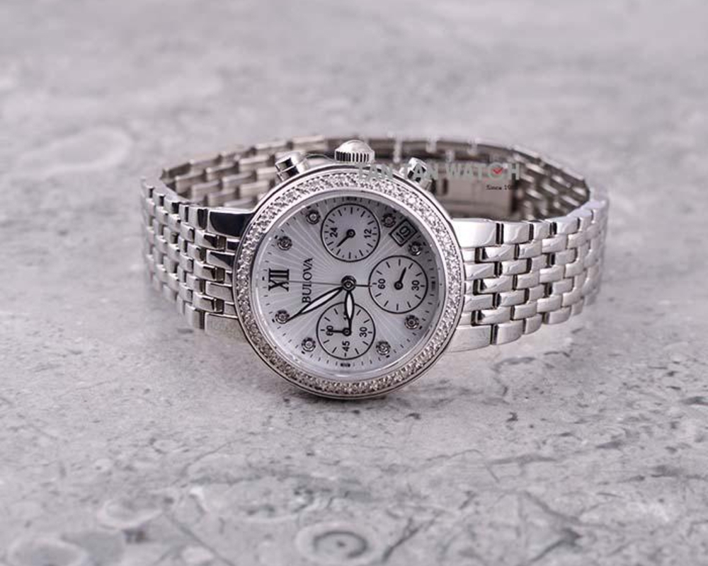 1. Bulova 96W204 - Mặt số xà cừ thanh lịch và sức hút khó cưỡng của 8 viên kim cương cao cấp