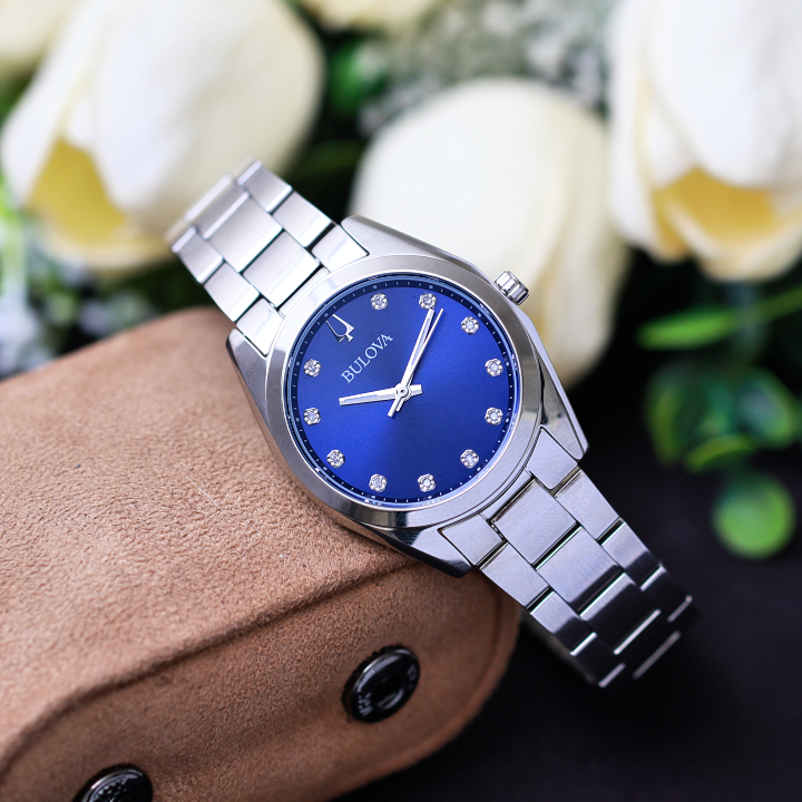 Khoác trên mình lớp vỏ màu bạc nguyên bản của chất liệu thép không gỉ, cứng cáp trải qua nhiều công đoạn chế tác tỉ mỉ và tinh xảo, Bulova 96P229 đem đến cho người dùng là vẻ ngoài mang nét cổ điển nhưng thời thượng không bao giờ lỗi mốt. Điểm nhấn của toàn bộ thiết kế là mặt số đắt giá với 11 viên đá kim cương sáng lấp lánh được đính hoàn toàn bằng thủ công một cách hoàn mỹ trên nền xanh dương, cùng biểu tượng khắng định đẳng cấp của của chiếc đồng hồ là Logo Bulova có tông bạc ở vị trí 12h. Kết hợp họa tiết vân sunray đồng tâm với khả năng tạo hiệu ứng chuyển màu và phản sáng theo từng góc nhìn, từng chuyển động của các nàng sành điệu.