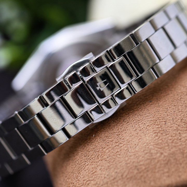 Sử dụng thép không gỉ cho toàn bộ vỏ và dây đeo, Bulova 96P229 không chỉ mang đến một mẫu đồng hồ được giới chuyên môn đánh giá về khả năng chống ăn mòn và tính năng kháng từ mạnh mẽ mà còn về độ chế tác tỉ mỉ, thiết kế kì công dây đeo 3 mắt chắc chắn. Phần lug liền lạc với khung vỏ tạo dáng tonneau thời thượng, đường kính vỏ 32mm, độ dày 8mm, cảm giác lên tay cực thoải mái và nhẹ nhàng ôm trọn cổ tay các nàng.