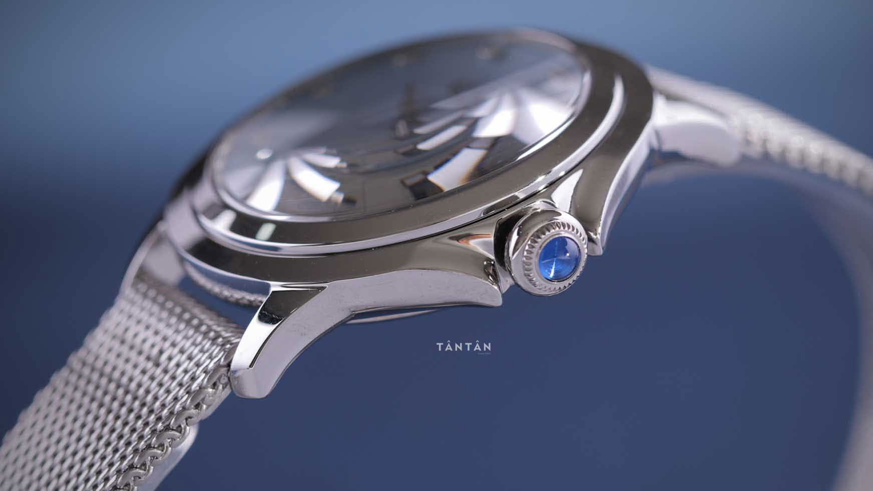✓ Bộ vỏ hai viền bằng thép không gỉ sáng bóng, bền bỉ với núm chỉnh đính đá spinel màu xanh độc đáo.