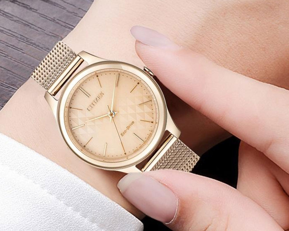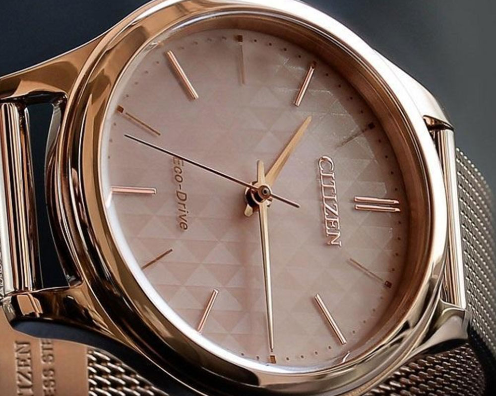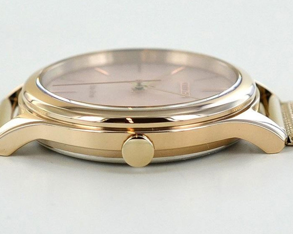 Bên cạnh đó, Citizen EM0503-83X còn được trang bị dây đeo thép không gỉ nguyên khối thiết kế dạng lưới mesh với những tính năng nổi trội mà các loại chất liệu khác không có đó là độ bền, độ cứng cao hơn giúp chống trầy xước khi va chạm. Với kết cấu được xem là không thể phá hủy, dây đeo cũng được hoàn thiện tỉ mỉ phủ màu vàng hồng, đánh bóng tạo nên vẻ ngoài đồng hồ bắt mắt hơn, khi nghiêng đồng hồ theo góc sáng bộ dây sẽ phản chiếu lại ánh sáng rất đẹp mắt. Đi cùng bộ dây là khóa gập với cơ chế trượt vào để đóng-mở, dễ dàng điều chỉnh độ rộng theo từng kích thước cổ tay. Với cơ cấu đơn giản các quý cô có thể sử dụng dễ dàng hàng ngày khi tháo ra và mang vào.