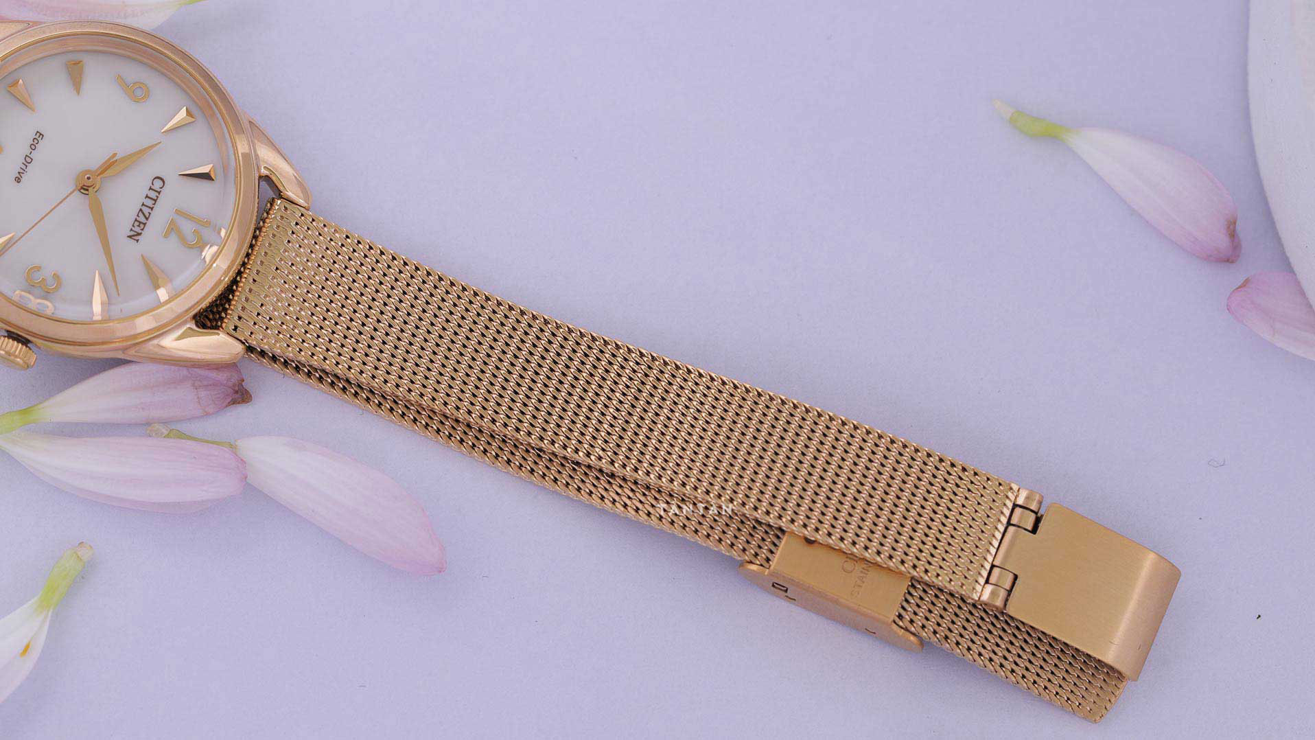 Bên cạnh đó, thương hiệu cũng trang bị cho Citizen EM0687-89P dây đeo được chế tác bằng thép không gỉ dạng lưới và mạ PVD màu vàng Gold cùng tông màu tổng thể. Đây được coi là loại dây không có khuyết điểm, gồm nhiều mắt xích liên kết chặt chẽ với nhau tạo thành mạng lưới chắc chắn, khó bị trầy xước do tác động ngoại lực và bền bỉ với thời gian. Vì vậy, dây lưới đồng hồ luôn mềm mại, dẻo dai, ôm sát cổ tay người đeo. Thêm vào đó, bằng việc kết hợp dây đeo thép sáng bóng sẽ mang đến phong cách thời trang ấn tượng, làm nổi bật sự sang trọng, trang nhã cho người đeo. Đi kèm với dây lưới là khóa gập với cơ chế trượt để đóng, giúp dây đeo gọn gàng vừa vặn và chắc chắn trên cổ tay.