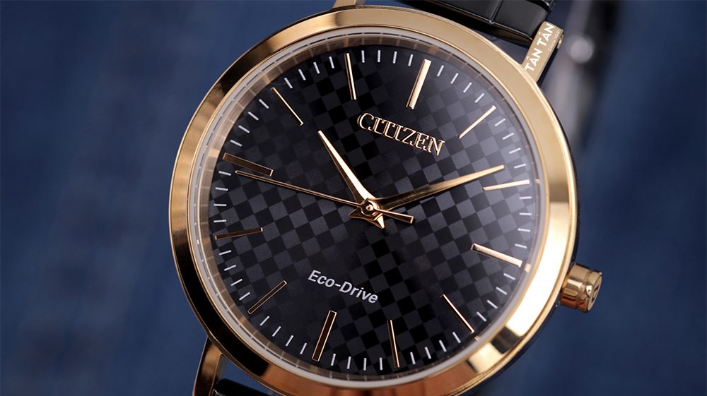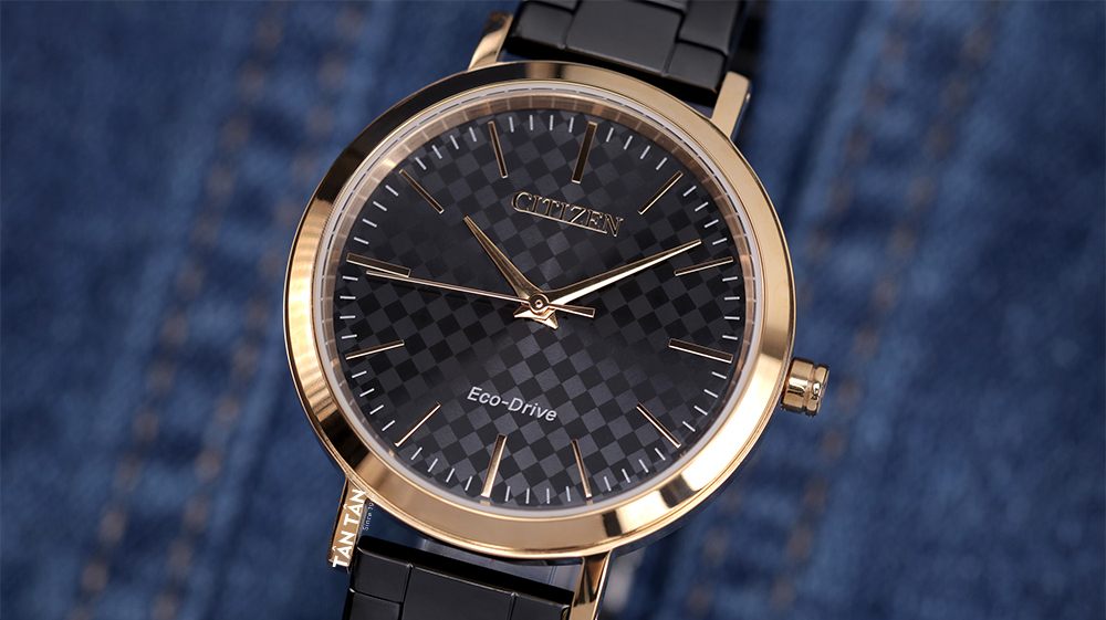 Citizen EM0768-54E chiếm trọn tình cảm của phái đẹp bởi thiết kế mặt số màu đen đặc trưng với họa tiết vân caro bắt mắt. Nổi bật trên đó là bộ kim dạng dauphine được vuốt nhọn tinh tế, cùng cọc số được tạo hình thanh mảnh và được bao phủ một lớp mạ màu vàng hồng nổi bật bằng công nghệ mạ PVD khó phai màu. Những nét đơn ngắn màu trắng được bố trí trải đều trên vòng chỉ thời gian mang đến trải nghiệm đọc thời gian dễ dàng và chính xác hơn. Bên cạnh đó, logo “Citizen” được khắc nổi tinh xảo và mạ vàng hồng bóng bẩy thể hiện giá trị độc quyền của thương hiệu từ xứ sở mặt trời mọc, đi cùng bộ máy trứ danh “Eco-drive” đình đám thể hiện rõ bằng các nét trắng nổi bật. Thêm vào đó, Citizen còn điểm xuyết cho viền thép sát ngoài mặt số màu vàng hồng càng tôn lên nét đẹp của đồng hồ cao cấp Citizen EM0768-54E.