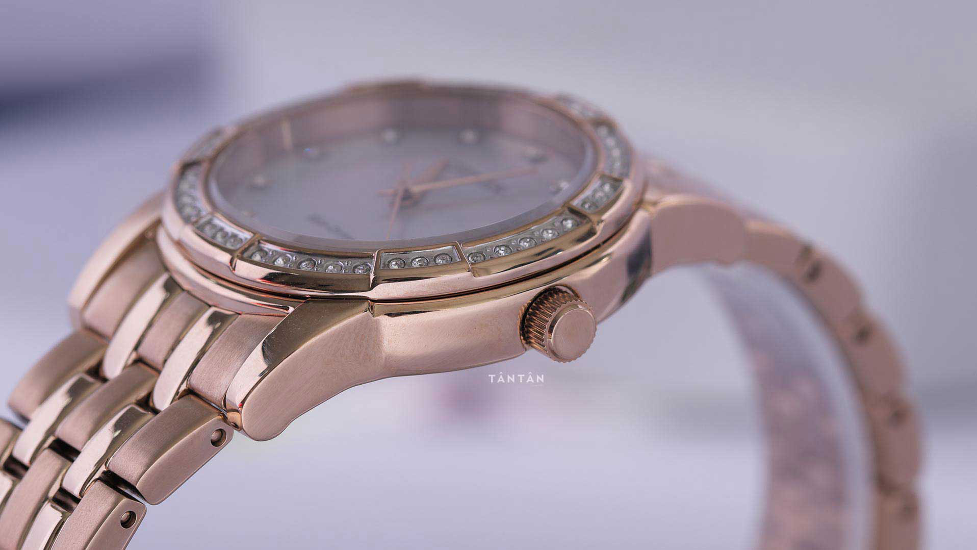Khung vỏ màu vàng hồng của Citizen EM0773-54D có đường kính 31mm với thiết kế bo tròn và được làm mỏng để ngoại diện của chiếc đồng hồ trở nên thanh thoát, gọn gàng nhất có thể. Điểm nổi bật nhất không thể bỏ qua chính là viền bezel nạm kín những viên đá Swarovski lấp lánh càng khiến cho Citizen EM0773-54D rực rỡ hơn bao giờ hết trên cổ tay ngọc ngà của những cô nàng thanh tú. Cạnh phải đồng hồ ở góc 3 giờ là núm chỉnh giờ tròn trịa được thiết kế nhỏ gọn với các khía rãnh xung quanh, tăng tính thẩm mỹ đồng thời tạo điều kiện thuận lợi cho các thao tác chỉnh giờ.