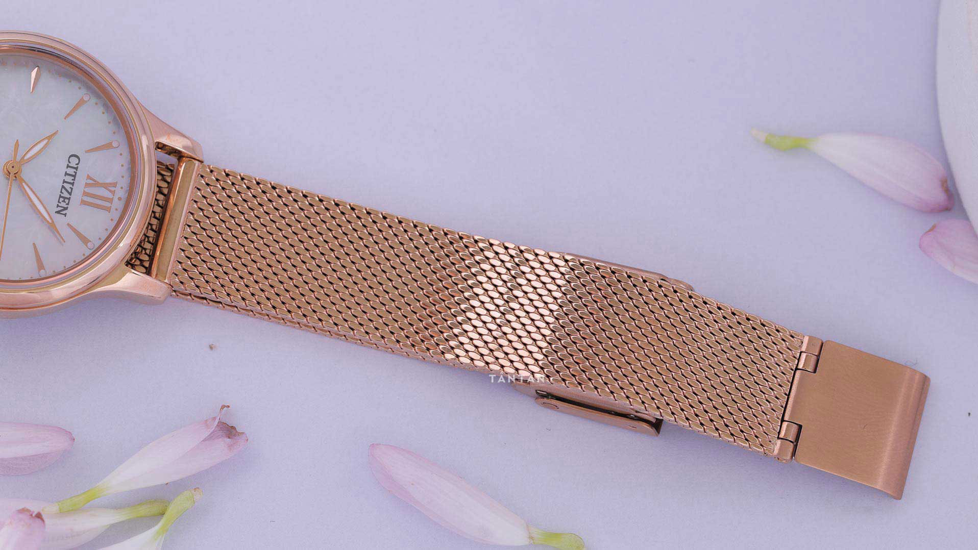 Phần dây đeo của Citizen EM0892-80D làm bằng chất liệu thép không gỉ dạng lưới mesh mỏng nhẹ cực kỳ ôm tay. Sử dụng kiểu dây hiện đại, thanh lịch với các sợi thép liên kết tạo nên khối liên kết bền chặt, khó phá hủy với bề mặt bộ dây được chải xước toàn bộ mang ánh vàng hồng sáng bóng thêm phần ấn tượng hơn, thời trang hơn. Kết hợp với khóa gập chắc chắn, tiện lợi giúp cố định chắc chắn đồng hồ khi trên tay, đảm bảo thoải mái trong mọi hoạt động của các nàng. Đặc biệt với cơ chế trượt vào để đóng, dễ dàng điều chỉnh độ rộng của cổ tay.