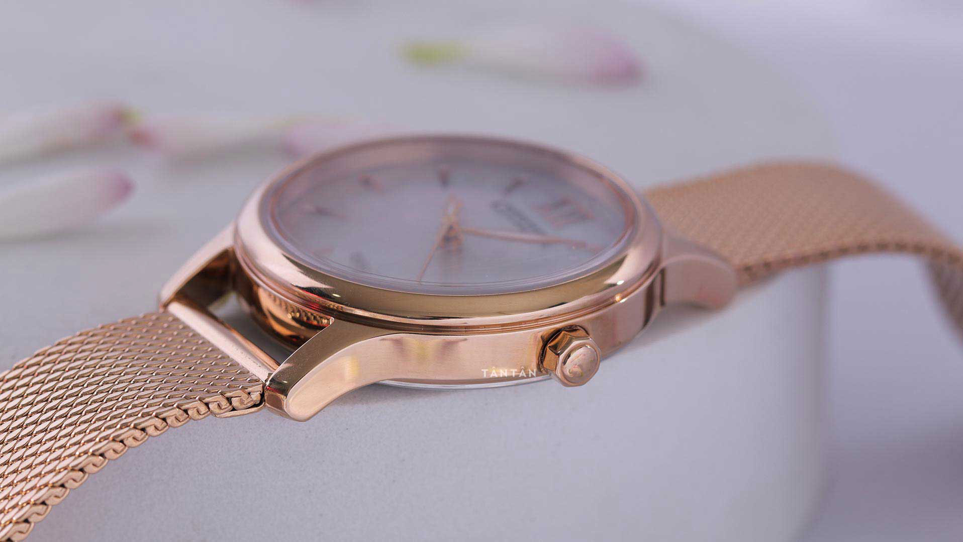 Citizen EM0892-80D sở hữu khung vỏ bo tròn làm bằng chất liệu thép không gỉ với các đặc tính vượt trội vốn có đó là độ bền bỉ, cứng cáp ngăn chặn những va đập ngoài ý muốn cũng như duy trì tuổi thọ của chiếc đồng hồ. Toàn bộ vỏ được mạ PVD màu vàng hồng hoàn thiện phay xước nhẹ để tạo độ sáng bóng tự nhiên và làm mỏng nhẹ cùng với viền bezel được gọt giũa nhỏ bản bo tròn mượt mà tạo sự gọn gàng, thêm nét kiêu sa cho tổng thể chiếc Citizen EM0892-80D. Cạnh phải đồng hồ là núm chỉnh tròn trịa vát cạnh bát giác thuận tiện cho thao tác chỉnh giờ, đồng thời tăng thêm tính thẩm mỹ cho chiếc đồng hồ.