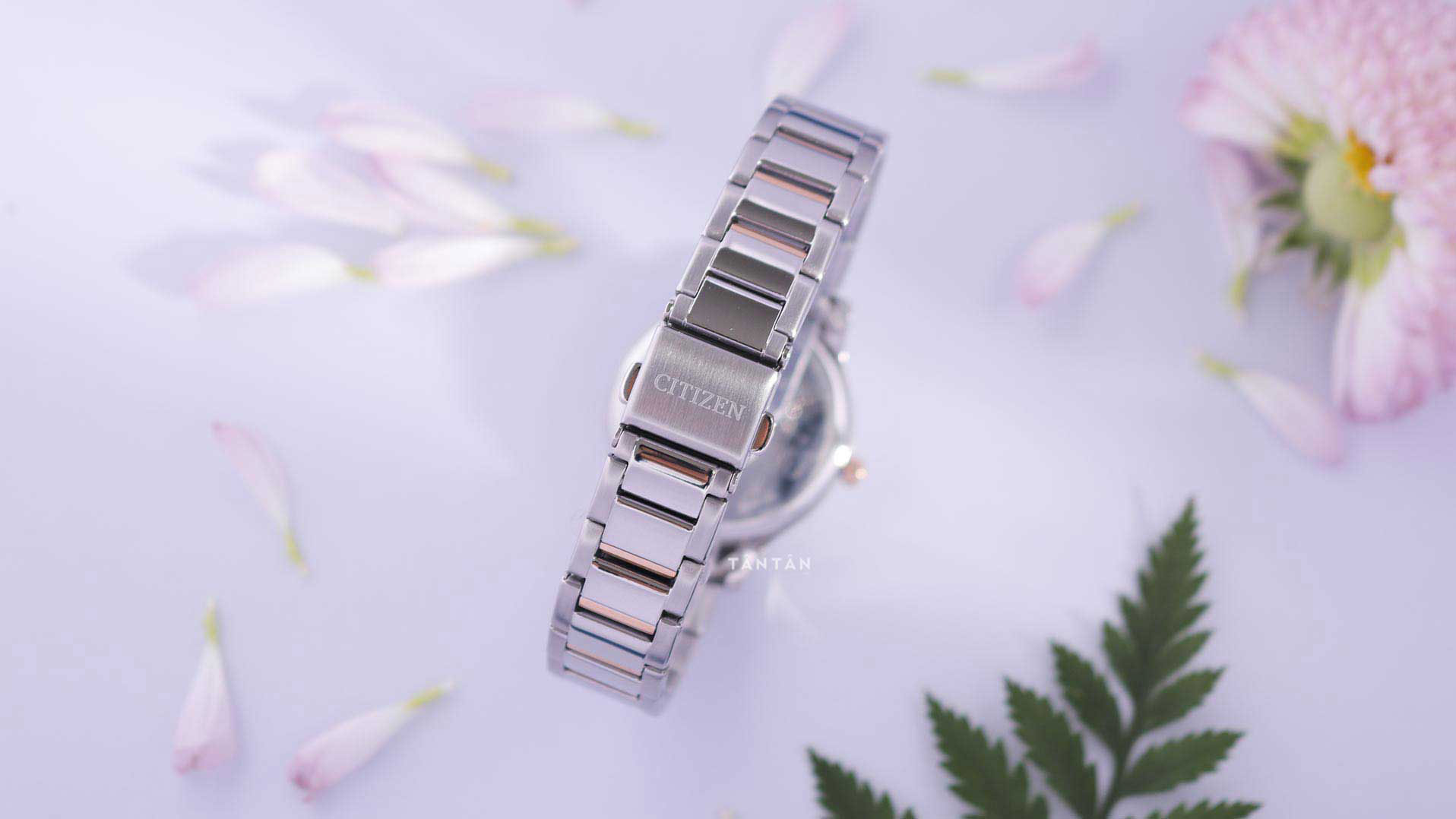 Phần dây đeo của đồng hồ nữ Citizen EM0895-73A làm bằng chất liệu thép không gỉ dạng mắc xích đơn dạng chữ Y với những đường cắt cá tính, mạnh mẽ. Bề mặt bộ dây được chải xước toàn bộ mạ demi màu vàng hồng ở viền trong liên kết tạo điểm nhấn cho dây đeo thêm phần ấn tượng hơn, thời trang hơn. Kết hợp với khóa gập đơn giản với nút bấm tiện lợi giúp cố định chắc chắn đồng hồ khi trên tay, đảm bảo thoải mái trong mọi hoạt động của các nàng.