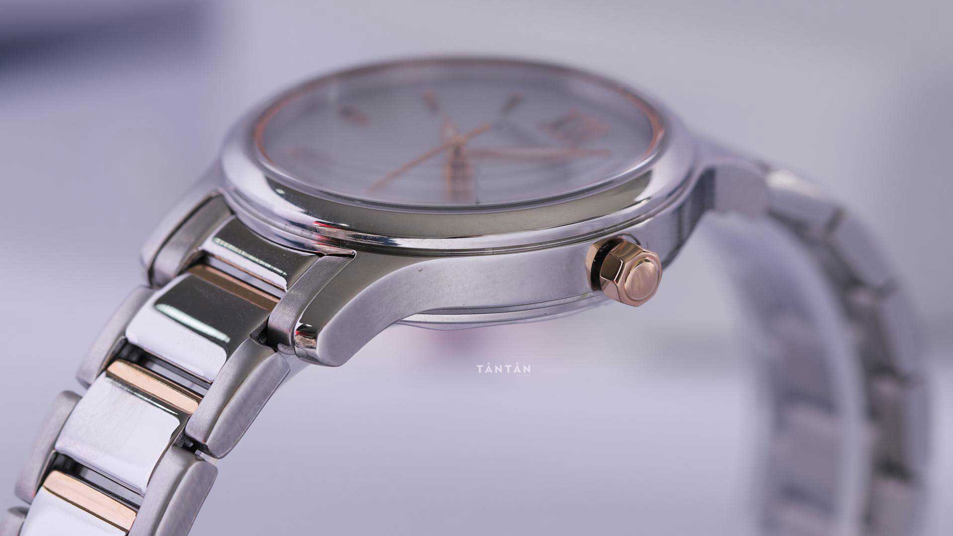 Citizen EM0895-73A sở hữu khung vỏ bo tròn làm bằng chất liệu thép không gỉ với các đặc tính vượt trội vốn có đó là độ bền bỉ, cứng cáp ngăn chặn những va đập ngoài ý muốn cũng như duy trì tuổi thọ của chiếc đồng hồ. Toàn bộ vỏ được hoàn thiện phay xước nhẹ để tạo độ sáng bóng tự nhiên và làm mỏng nhẹ cùng với viền bezel được gọt giũa nhỏ bản bo tròn mượt mà tạo sự gọn gàng, thêm nét kiêu sa cho tổng thể chiếc Citizen EM0895-73A. Cạnh phải đồng hồ là núm chỉnh tròn trịa màu vàng hồng vát cạnh bát giác thuận tiện cho thao tác chỉnh giờ, đồng thời tăng thêm tính thẩm mỹ cho chiếc đồng hồ.