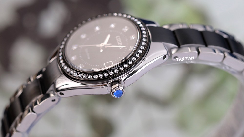 Bộ vỏ đồng hồ nữ Citizen EW2558-88E có đường kính là 25mm được chế tác bởi chất liệu thép không gỉ cao cấp với bề mặt chủ yếu được đánh bóng để làm tăng tính sang trọng cho đồng hồ. Niềng bezel phía trên cũng được đính thêm những viên đá Swarovski lấp lánh bao phủ toàn bộ mặt số tạo nên sự sang trọng, bắt mắt. Và ở cạnh phải góc 3h quen thuộc là núm chỉnh giờ dạng đa giác, thiết kế trơn nhẵn đính thêm một viên đá spinel xanh tinh tế. Ngoài ra, đồng hồ còn cho khả năng chống nước ở mức WR50 (tương đương áp suất ở độ sâu 50m nước) hỗ trợ rửa tay, đi mưa hoặc đi tắm mà không lo đồng hồ bị vô nước.