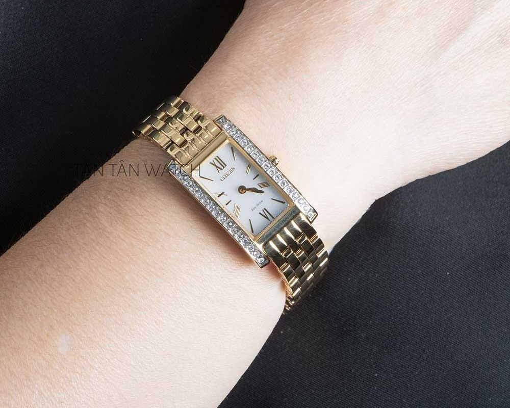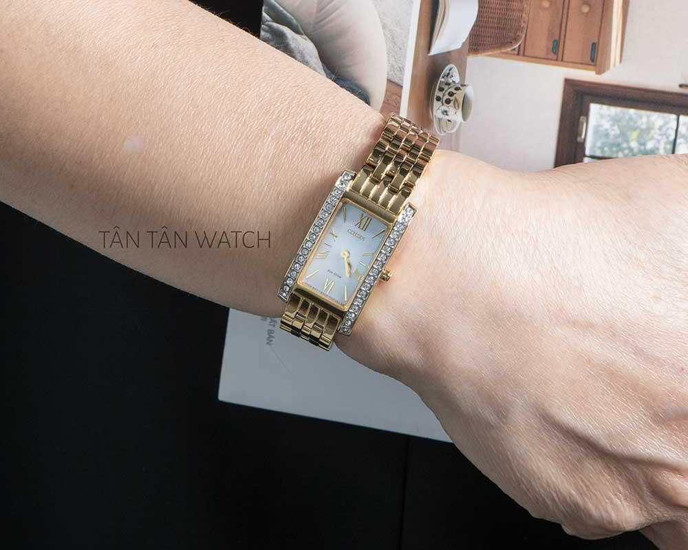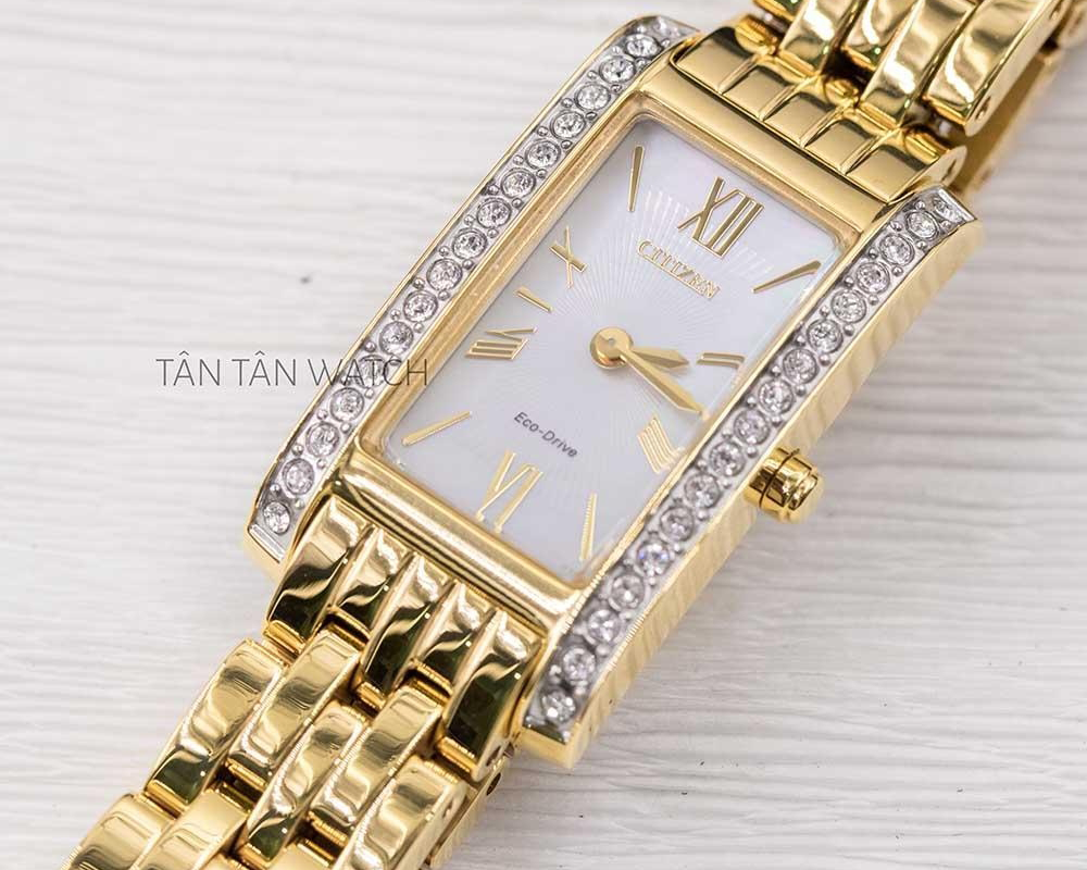Chinh phục phái đẹp từ ngay ánh nhìn đầu tiên, Citizen EX1472-81D sở hữu bộ vỏ chữ nhật thời thượng với vẻ ngoài ngọt ngào, thanh lịch và sang trọng đậm chất Citizen. Chiếc đồng hồ này có tông màu vàng nổi bật kết hợp cùng mặt số xà cừ, đá Swarovski cao cấp đến bộ máy Eco-Drive độc quyền không phải thay pin thường xuyên sẽ là chiếc phụ kiện cho các cô nàng.