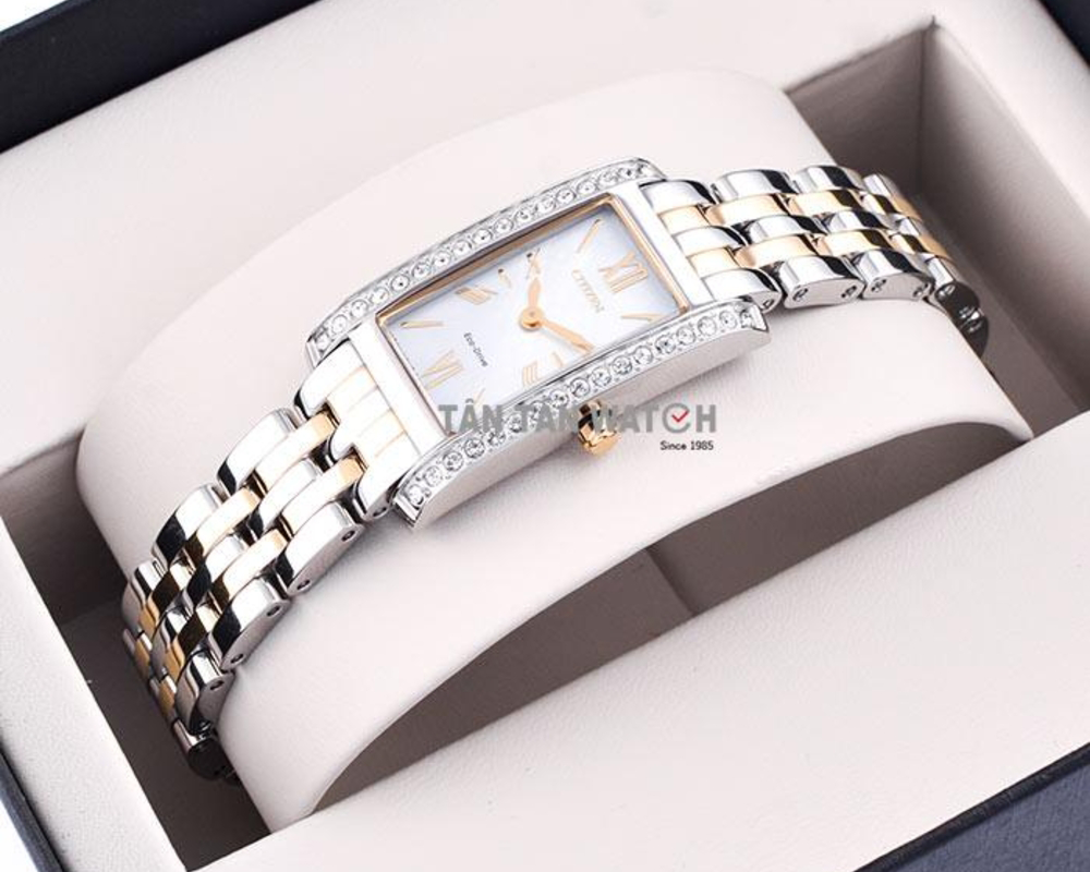 Chinh phục phái đẹp từ ngay ánh nhìn đầu tiên, Citizen EX1474-85D sở hữu bộ vỏ chữ nhật thời thượng với vẻ ngoài ngọt ngào, thanh lịch và sang trọng đậm chất Citizen. Chiếc đồng hồ này có tông màu demi vàng gold - bạc nổi bật kết hợp cùng mặt số xà cừ, đá Swarovski cao cấp đến bộ máy Eco-Drive độc quyền không phải thay pin thường xuyên sẽ là chiếc phụ kiện cho các cô nàng.