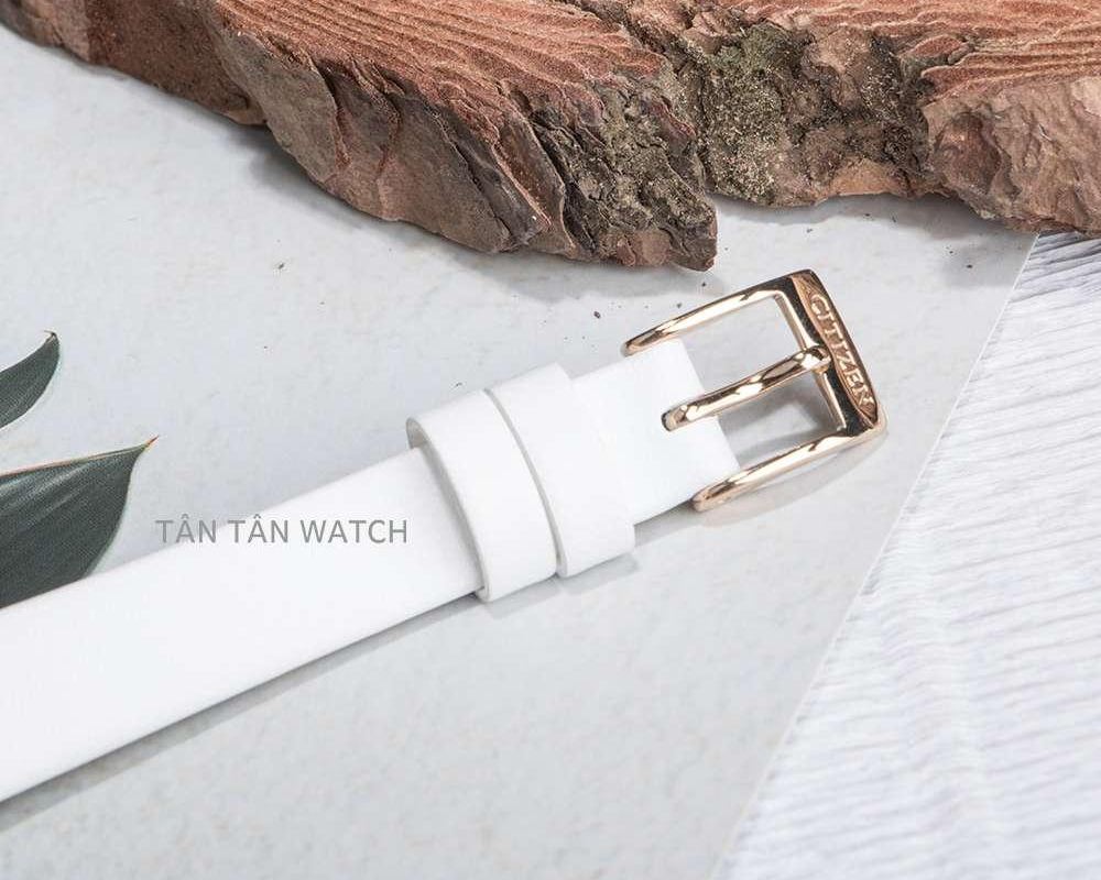 Đi kèm với bộ vỏ chữ nhật là dây da mềm nhẹ với mặt ngoài trơn thuộc trắng trang nhã, không may viền thời trang dễ đeo với khóa cài đơn giản. Bảo vệ mặt số của Citizen EX1478-17D là mặt kính kính khoáng chịu lực tốt và dễ dàng đánh bóng như mới sau một khoảng thời gian sử dụng. Ngoài ra, đồng hồ nữ Citizen EX1478-17D trang bị khả năng chống nước WR30 (tương đương áp suất ở độ sâu 30m nước) vừa đủ để hỗ trợ rửa tay, đi mưa nhỏ.