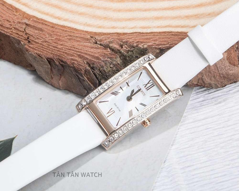 Phiên bản đồng hồ Citizen EX1478-17D có thiết kế bộ vỏ chữ nhật cá tính đi kèm dây da mềm nhẹ thuộc trắng thanh nhã trên cổ tay các nàng. Bền mặt bộ vỏ mạ PVD màu vàng hồng với dọc hai bên niềng bezel nạm kín đá swarovski lấp lánh, chi tiết này giúp mặt số trở nên bừng sáng và cực kỳ tôn da khi đeo lên tay. Với đường kính vỏ 32x18mm cùng độ mỏng đáng kinh ngạc chỉ 6.8mm, chiếc đồng hồ sẽ thích hợp với mọi cổ tay của những cô nàng Châu Á.