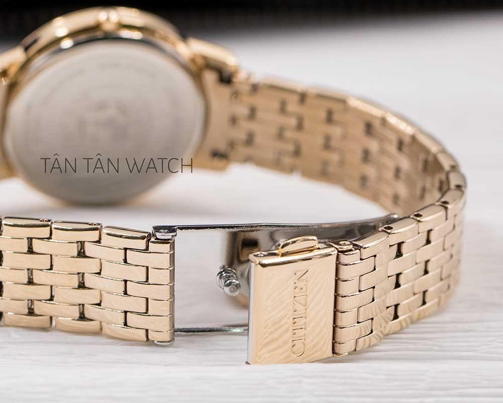 Citizen EX1483-84A sở hữu dây đeo thép không gỉ thiết kế 7 liên kết uyển chuyển, ôm tay với khóa gập chắc chắn. Bề mặt dây được mạ màu vàng hồng bởi công nghệ PVD tân tiến. Khi đeo lên không tạo cho người dùng cảm giác nặng tay, ngược lại còn rất thuận tiền dù là mang đi chơi, đi làm hay thậm chí là vào bếp đều không gây khó chịu cho các nàng.