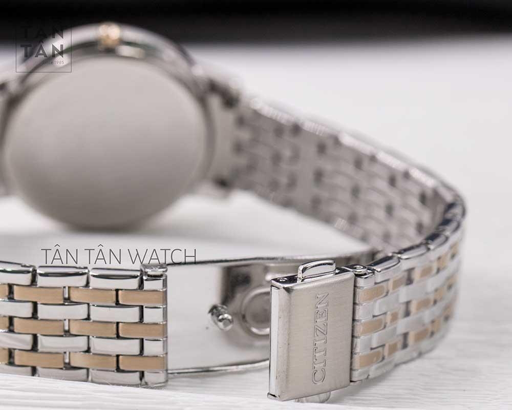 Để hướng đến phiên bản đồng hồ thời trang mang phong cách thanh lịch và nhẹ nhàng thì việc trang bị bộ dây thép 7 liên kết mạ demi màu vàng hồng, kết hợp đánh bóng các mắt dây trắng tạo nên một Citizen EX1496-82A đầy phong cách, thời trang trẻ trung vừa ôm trọn cổ tay của nàng một cách êm ái và thoải mái nhất. Đi cùng dây đeo thép là khóa gập chắc chắn với nút bấm dễ sử dụng.