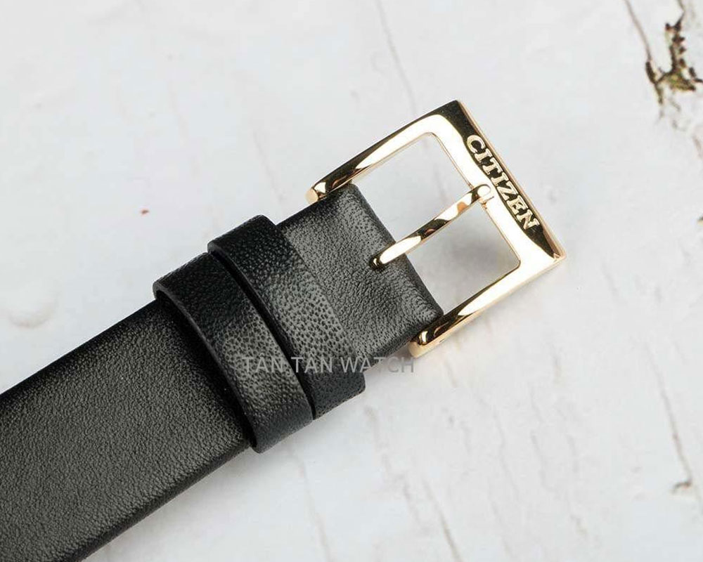 Bên cạnh đó, Citizen FE7042-07D còn được trang bị dây đeo chất da cao cấp mềm mại trên cổ tay. Dây đeo không may viền dạng ép thuộc nâu vừa mềm nhẹ, nữ tính vừa hợp cá tính và thời trang. Đi liên với day da là khóa cài đơn giản màu vàng dập logo tinh tế dễ dàng đeo vào hay tháo ra, giúp cố định chắc chắn đồng hồ trên cổ tay.