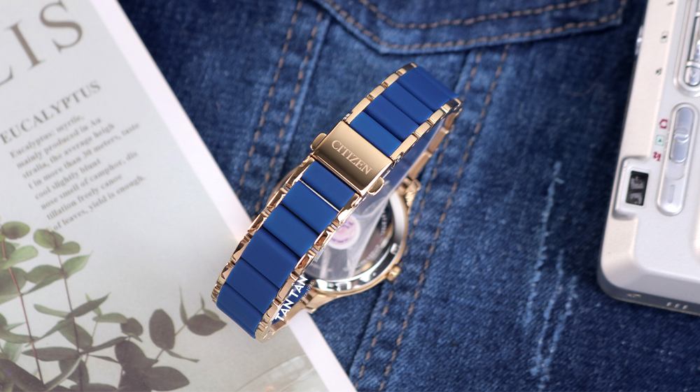 Ngoài ra, chiếc đồng hồ thời trang này còn được trang bị dây đeo làm bằng thép không gỉ cao cấp cùng chất liệu cao su bền nhẹ. Việc sử dụng kết hợp hai chất liệu này giúp đồng hồ nhẹ hơn, hạn chế ăn mòn tốt hơn và dễ dàng phối màu để hợp thời trang hơn. Dây đeo có ba mắt liên kết với nhau rất chắc chắn, mắt giữa bọc cao su (silicone) có tông màu xanh dương nổi bật và trẻ trung, tạo điểm nhấn khác biệt cho đồng hồ. Cuối dây đeo là phần khóa gập thường thấy, trang bị thêm nút bấm tiện lợi có thể dễ dàng tháo ra - lắp vào, chắc chắn ôm trọn cổ tay.