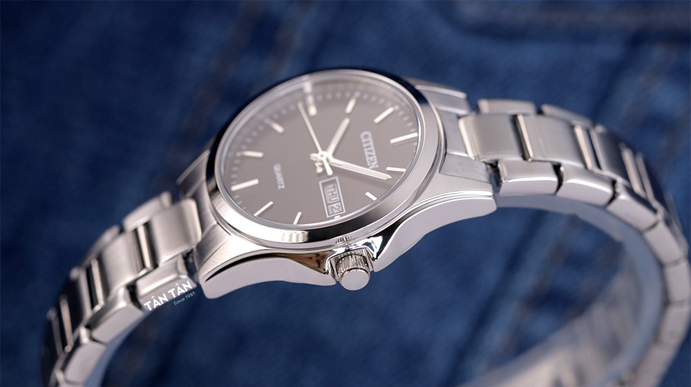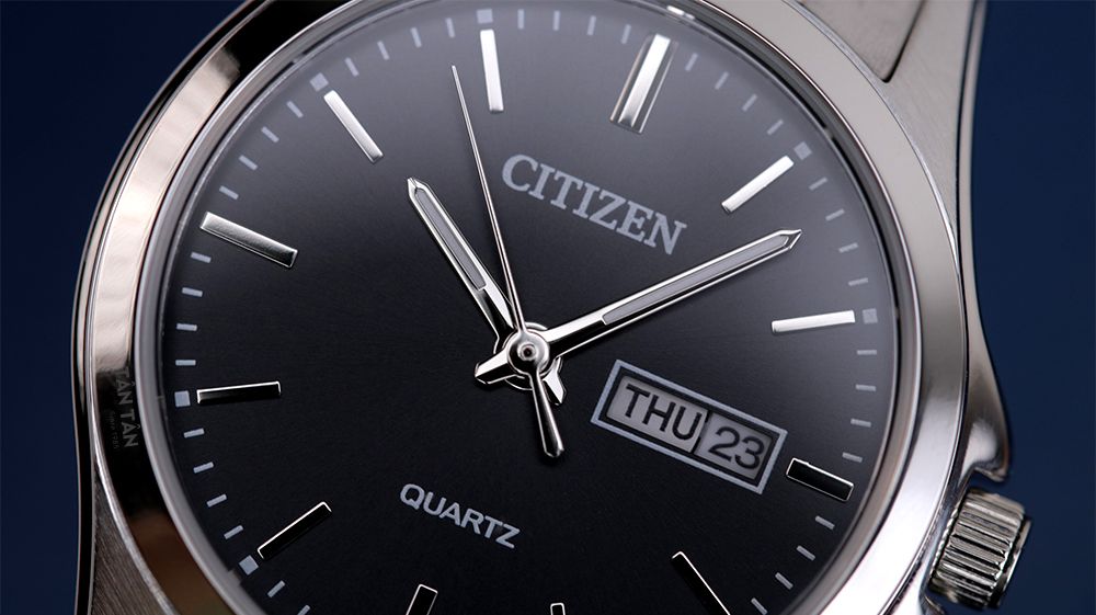 Trên mặt số đơn giản là các mốc giờ thể hiện bằng các vạch index nổi khối thon dài màu trắng bạc được gọt giũa tinh tế trải đều trên vòng chỉ thời gian giúp người dùng thuận tiện xem giờ. Ở các mốc 3-6-9 dày hơn và nét đôi dày dặn tạo điểm nhấn ở vị trí 12 giờ. Góc 12 giờ luôn là tâm điểm đắt giá với logo “Citizen” độc quyền với ý nghĩa trong tiếng Anh là “người dân”, các nhà sáng lập Citizen mong muốn quốc tế hóa thương hiệu, mang đến chất lượng sản phẩm tốt và giá cả hợp lý cho người dân sử dụng. Thêm vào đó, thông tin về bộ máy “Quartz” cũng được thể hiện ở hướng 6 giờ bằng những nét trau chuốt sắc sảo và được phủ một màu trắng khá riêng biệt. Góc 3 giờ được trang bị cả lịch thứ - lịch ngày hỗ trợ quản lý thời gian tốt hơn.