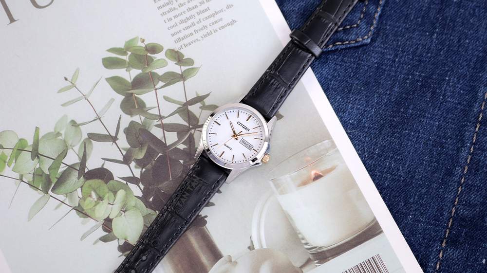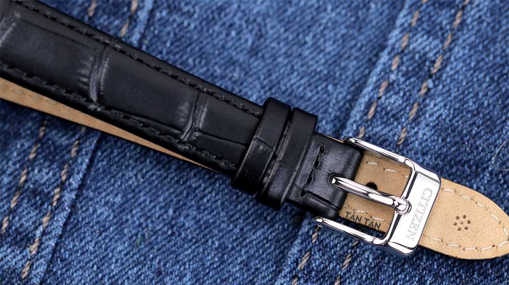 Đi kèm theo là dây đeo chất da cao cấp mềm mại, nhẹ nhàng trên cổ tay. Sử dụng dây da để tôn lên nét thanh lịch, quý phái của những người phụ nữ hiện đại. Dây da hai lớp được may chắc chắn bởi đường chỉ thẩm mỹ dọc viền dây, với bề mặt thuộc đen, dập vân sang trọng. Ở chiếc Citizen EQ0559-11A này vẫn sử dụng khóa cài đơn giản thường thấy, với sự tiện lợi dễ dàng đóng mở và cố định chắc chắn trên cổ tay.