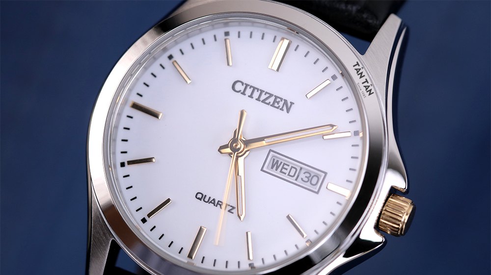 Trên mặt số đơn giản là các mốc giờ thể hiện bằng các vạch index nổi khối thon dài màu vàng hồng được gọt giũa tinh tế trải đều trên vòng chỉ thời gian giúp người dùng thuận tiện xem giờ. Ở các mốc 3-6-9 dày hơn và nét đôi dày dặn tạo điểm nhấn ở vị trí 12 giờ. Góc 12 giờ luôn là tâm điểm đắt giá với logo “Citizen” độc quyền với ý nghĩa trong tiếng Anh là “người dân”, các nhà sáng lập Citizen mong muốn quốc tế hóa thương hiệu, mang đến chất lượng sản phẩm tốt và giá cả hợp lý cho người dân sử dụng. Thêm vào đó, thông tin về bộ máy “Quartz” cũng được thể hiện ở hướng 6 giờ bằng những nét trau chuốt sắc sảo và được phủ một màu đen khá riêng biệt. Góc 3 giờ được trang bị cả lịch thứ - lịch ngày hỗ trợ quản lý thời gian tốt hơn.