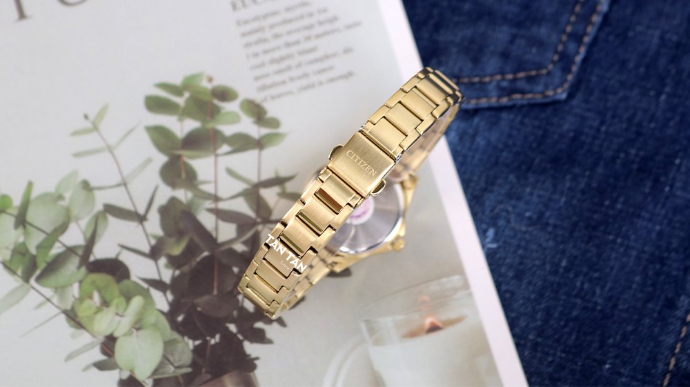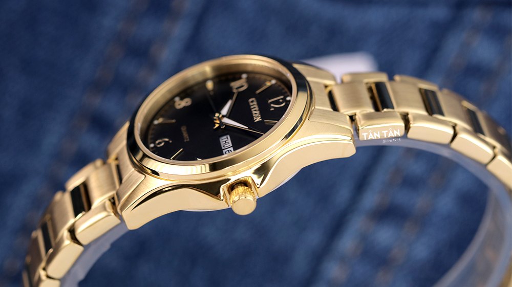 Các mốc giờ được hoàn thiện bằng các chữ số Arab xen kẽ các khối tam giác cân hướng tâm tạo nên một vòng chỉ thời gian độc đáo mang tính thẩm mỹ cao. Bao quanh bên ngoài là những chấm tròn trải đều cùng bộ kim dạng dauphine đầy tinh tế được bao phủ dạ quang tăng khả năng quan sát thời gian ngay cả trong điều kiện thiếu sáng. Nhờ vào chức năng dạ quang này mà vẻ đẹp của chiếc đồng hồ trở nên rạng rỡ bội phần và thu hút mọi sự chú ý khi diện trên tay vào buổi tối. Trên góc 12h đồng hồ là tên thương hiệu Citizen được in to rõ màu vàng, tại góc 6h thể hiện trái tim vận hành “quartz” bằng những nét sắc sảo để người dùng dễ dàng nhận biết. Hơn nữa, chiếc phụ kiện này được trang bị thêm các tính năng lịch ngày, lịch thứ tiện lợi đặt tại góc 3h cho phép nàng quản lý công việc của mình trên tất cả các khung thời gian.
