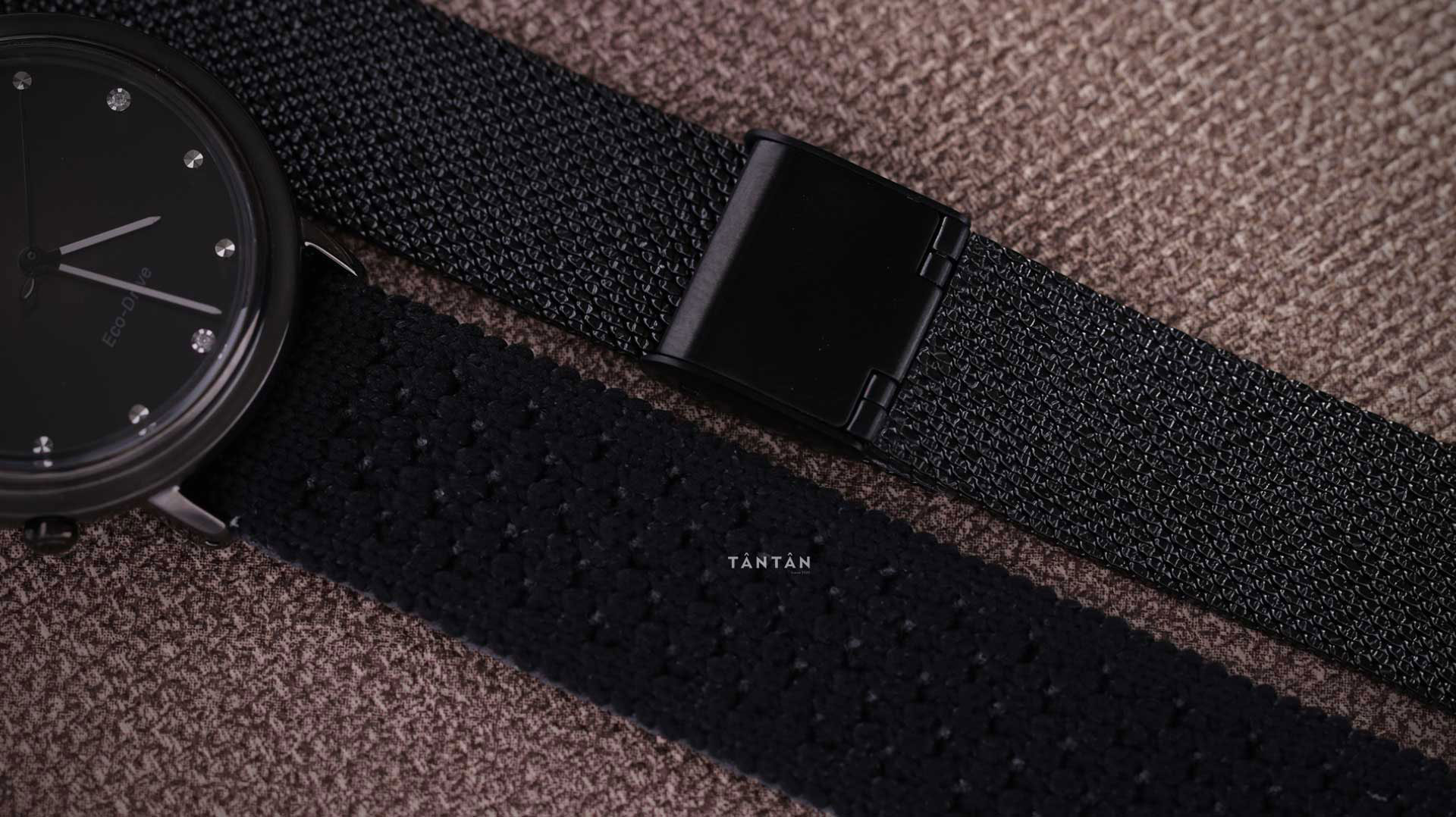 3. Vỏ thép không gỉ mạ thẩm thấu ion đen kết hợp với dây đeo đan sợi Wholegarment sang trọng, màu xanh thời thượng