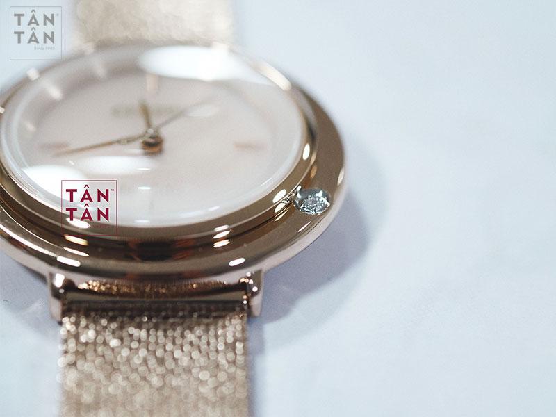 Một trong những điểm đặc biệt khác chính là niềng bezel đính kim cương ở góc 4 giờ. Đây là một chi tiết đắt giá thể hiện giá trị cao cấp của sản phẩm trong những thiết kế Citizen nữ đính kim cương. Sở hữu đường kính 31.5mm, chiếc đồng hồ sẽ vừa vặn với cổ tay các nàng và không kén sắc da và trang phục, Citizen EM0643-84X trở thành sự lựa chọn không thể hoàn hảo hơn dành cho những cô nàng có phong cách công sở lịch sự, nhẹ nhàng.