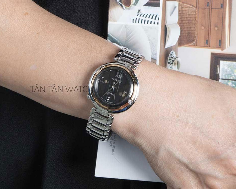 Điểm nhấn lớn nhất chính là niềng bezel được đính kim cương cao cấp. Chi tiết này đã tăng giá trị và tính thẩm mỹ của Citizen EM0658-87E, làm cho chiếc đồng hồ nữ cao cấp này càng được săn đón mạnh mẽ hơn.