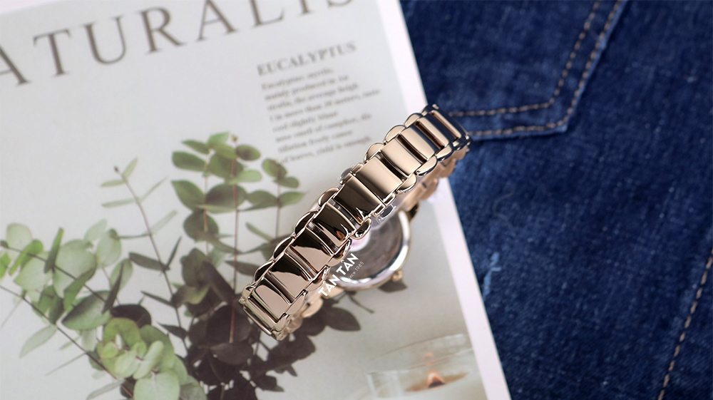 ✓ Thiết kế mặt số tinh giản, khảm xà cừ trắng với bộ kim Leaf điệu đà, nữ tính.