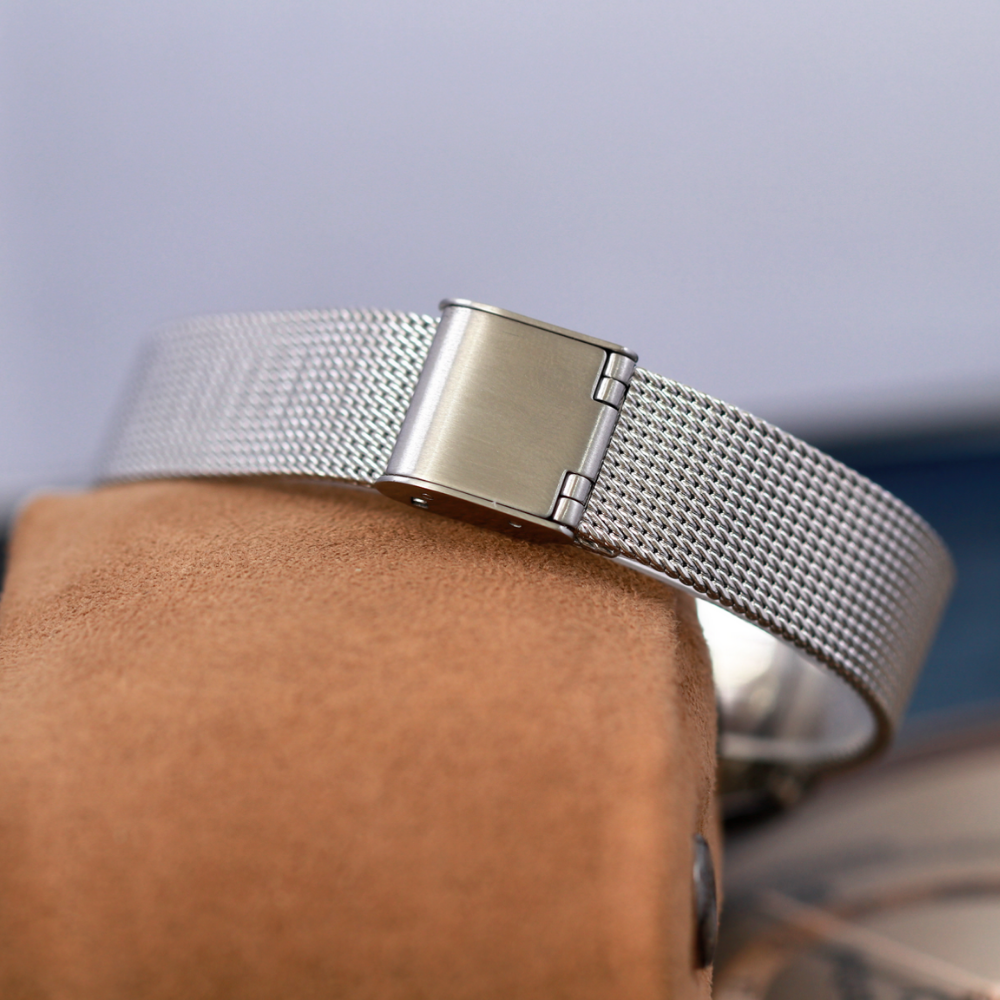 Vỏ và dây đeo thép không gỉ được hoàn thiện với công nghệ đánh bóng tiên tiến, tạo nên bề mặt bạc lấp lánh, sang trọng và khả năng chống ăn mòn vượt trội theo thời gian. Dây lưới kim loại được chế tác với độ chính xác cao, mang lại cảm giác mềm mại, linh hoạt và ôm khít cổ tay một cách tự nhiên, phù hợp với mọi hoạt động của phụ nữ hiện đại.