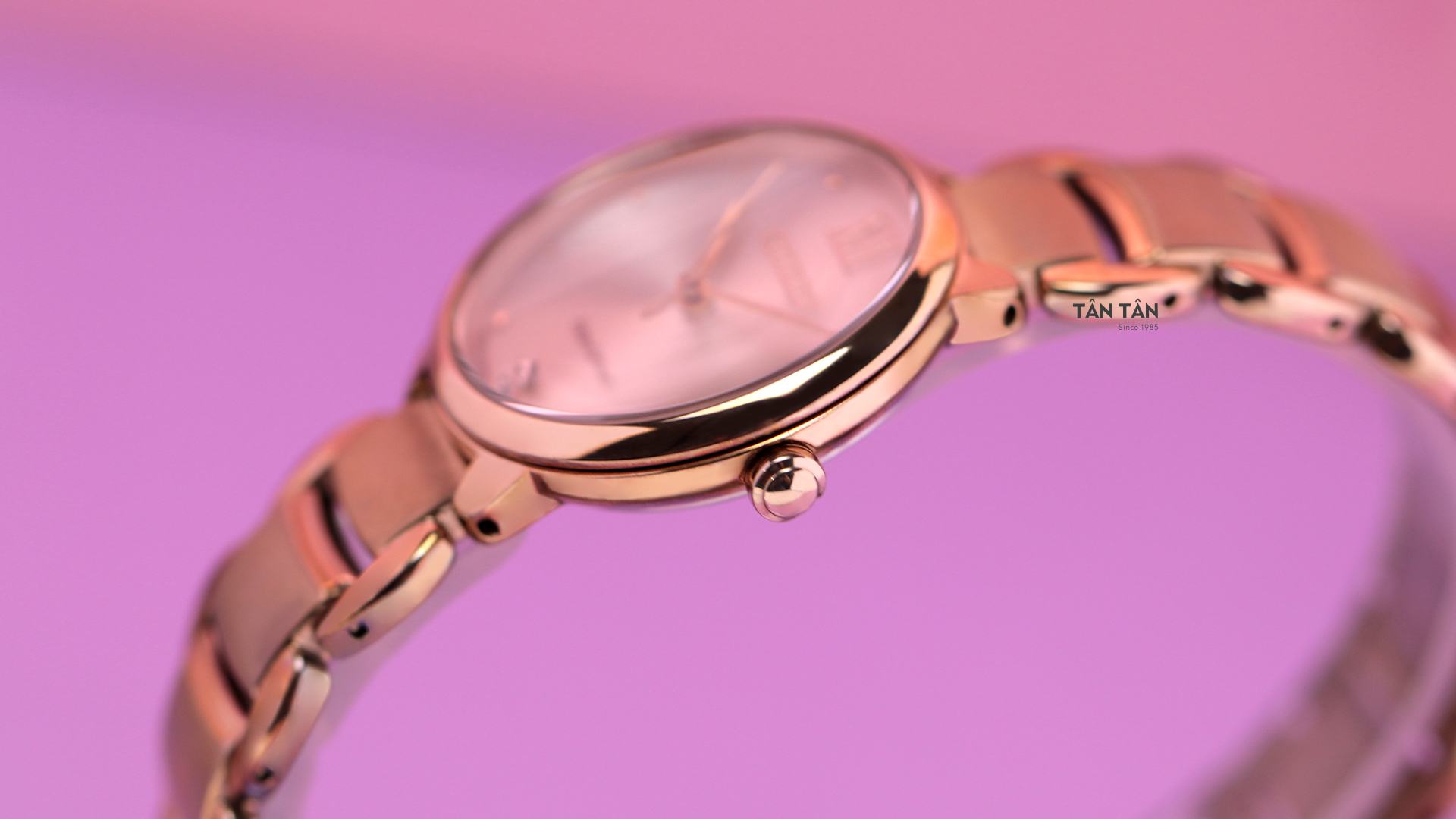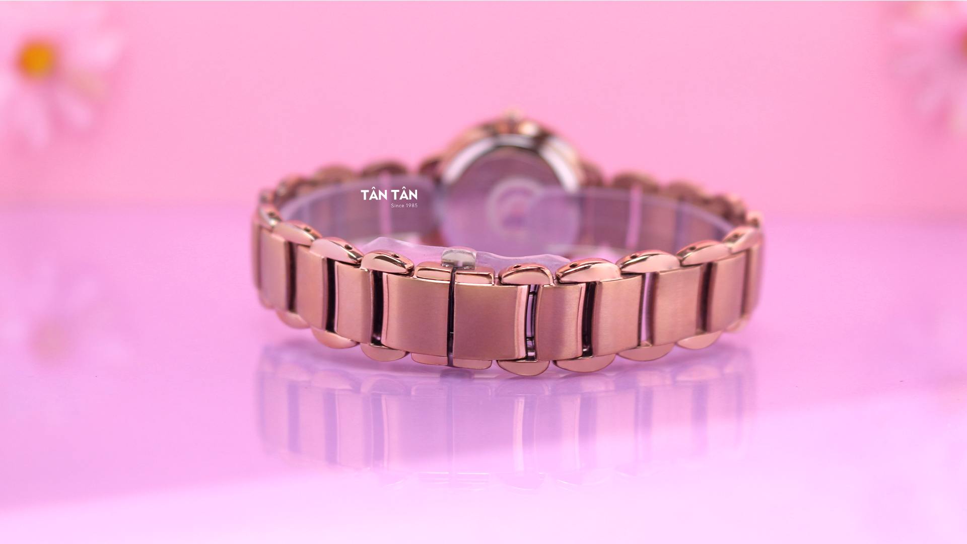 Bên cạnh đó, thiết kế dây đeo của Citizen EM0922-81X khá ấn tượng với dạng 3 liên kết nhưng được cách điệu thành các nét gợn sóng hai bên tạo cảm giác mềm mại và thướt tha khiến bao chị em say đắm. Đặc biệt hơn, liên kết giữa của dây đeo được hoàn thiện bằng kỹ thuật chải xước phay mang đến khả năng bắt sáng cao, với bề mặt phủ màu vàng hồng PVD mỗi khi chuyển động phần dây phản chiếu với ánh sáng mang lại hiệu ứng rất đẹp mắt và lôi cuốn. Ngoài ra, Citizen EM0922-81X còn có khả năng chống nước WR50 (tương đương khả năng chịu áp lực nước ở độ sâu 50m) cho phép rửa tay, đi mưa hoặc đi tắm.