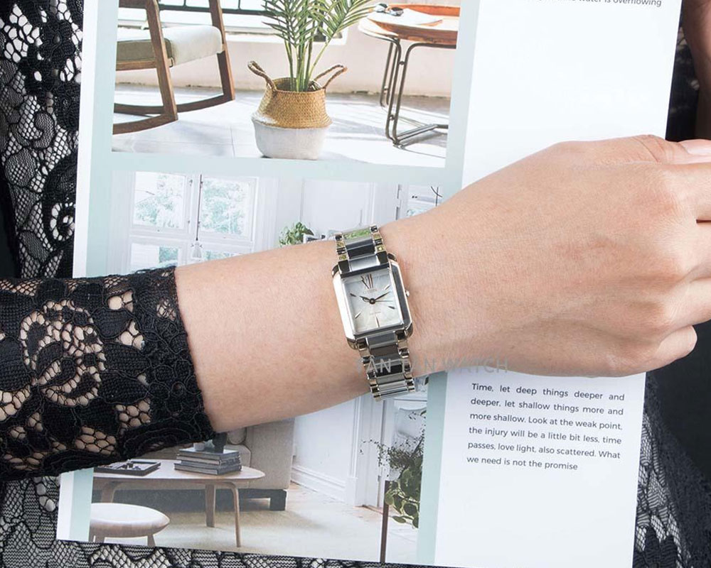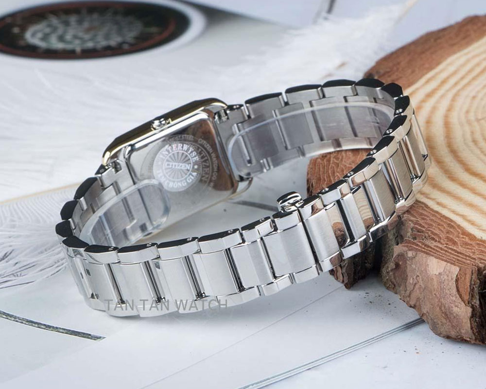 Thương hiệu Citizen luôn lựa chọn những chất liệu tốt nhất như thép không gỉ có thể đồng hành cùng chủ nhân theo từng dòng chảy của thời gian. Khung vỏ thép của Citizen EW5554-82D được đánh bóng kết hợp chải xước sáng láng trông hấp dẫn lạ kỳ. Núm chỉnh có thiết kế tròn trịa, gọn tạo nên sự cân đối. Bộ vỏ liền lạc với phần vấu nối tạo ra khối chữ nhật hiện đại với màu vàng gold dọc hai bên thêm thời thượng trên cổ tay các cô nàng. Trang bị dây đeo thép không gỉ thiết kế chắc chắn, dây đeo được hoàn thiện tỉ mỉ với những đường đánh bóng và đánh phay xước xen kẽ tạo thêm điểm nhấn trông thu hút hơn với accs mắt dây gấp khúc. Tuy thuộc kiểu dây đeo kim loại nhưng dây đeo của chiếc đồng hồ nữ này không hề thô cứng mà lại uyển chuyển mềm mại ôm trọn lấy cổ tay ngọc ngà của phái đẹp mang đến một cảm giác rất êm ái, nhẹ nhàng và thoải mái. Đi kèm theo là khóa cân bằng với nút bấm tiện lợi dễ dàng đeo vào hay tháo ra.
