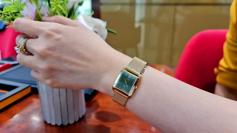 Nằm trong BST Citizen L 10th Aniversary, Citizen EW5593-72X đại diện cho sự phá cách, độc đáo nhưng không kém phần nữ tính, sang trọng và thời thượng. Với thiết kế mặt số hình chữ nhật độc đáo cùng màu chủ đạo vàng hồng - xanh lá, dây mesh đã trở thành xu hướng đối với các cô nàng ưa thích sự mới lạ. Không chỉ gây ấn tượng bởi các chi tiết nổi bật, chiếc đồng hồ này còn được trang bị bộ máy năng lượng ánh sáng mỏng nhẹ, vô cùng tiện lợi và hữu dụng với phái nữ.