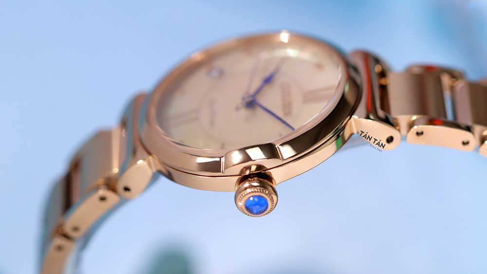 ✓ Bộ vỏ thép không gỉ mạ màu vàng hồng, đánh bóng với núm chỉnh giờ đính đá spinel màu xanh sang trọng.