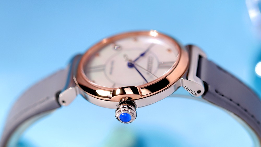 ✓ Bộ vỏ thép không gỉ đánh bóng mạ màu vàng hồng ở phần niềng bezel, với núm chỉnh giờ đính đá spinel màu xanh sang trọng.