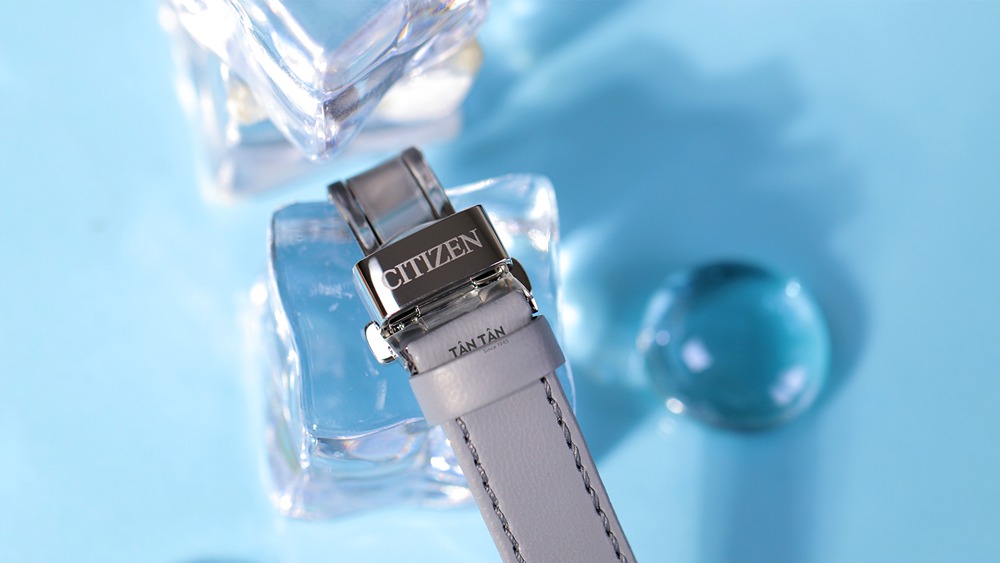 Bên cạnh đó, Citizen EM1074-15D được trang bị dây đeo chất da cao cấp mềm mại và nhẹ nhàng trên cổ tay. Dây đeo được nối với bộ vỏ qua phần vấu bo cong và gọn hơn phù hợp với nét nữ tính, nhẹ nhàng của phái đẹp. Dây da màu xám được may chắc chắn bởi đường chỉ thẩm mỹ, tỉ mỉ dọc viền dây đi kèm khoá bướm tiện lợi hạn chế gãy dây và thẩm mỹ. Phần khóa cong giúp cố định mặt số đồng hồ không bị dịch chuyển khỏi vị trí ban đầu trên cổ tay tạo cảm giác chắc chắn ôm trọn cổ tay giúp cho người đeo tự tin vận động thoải mái.