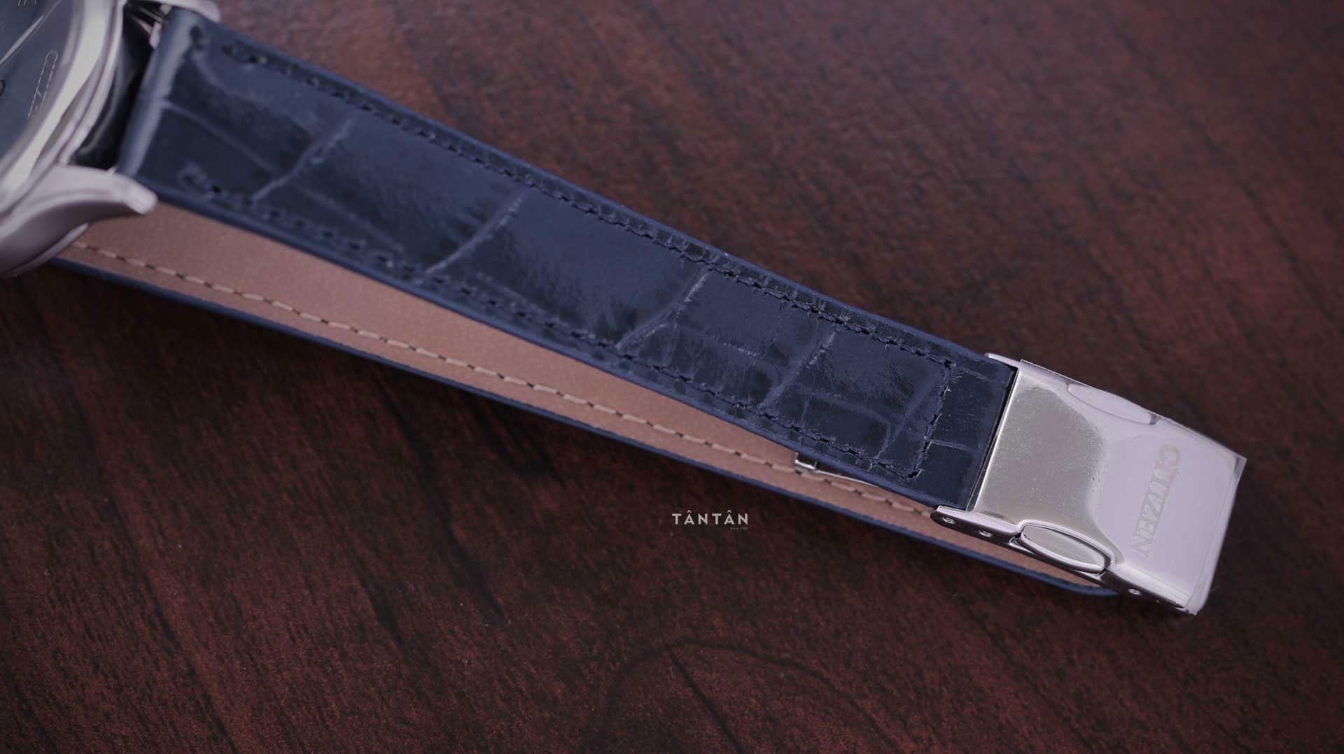 Bên cạnh đó, Citizen PR1041-18N còn được trang bị dây đeo chất da cao cấp mềm nhẹ trên cổ tay các nàng. Dây đeo hai lớp được may tỉ mỉ bởi đường chỉ thẩm mỹ dọc viền dây, với bề mặt thuộc xanh đen ton-sur-ton với mặt số mang đến tổng thể vô cùng thời trang. Đi cùng bộ dây là khóa cân bằng cao cấp hạn chế gãy dây với nút bấm tiện lợi và thẩm mỹ, với cơ cấu đơn giản giúp các quý cô có thể sử dụng dễ dàng hàng ngày khi tháo ra và mang vào.