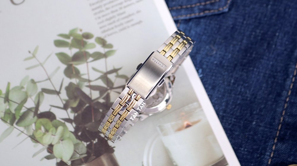 Tại vị trí 12 giờ là tên thương hiệu “Citizen” độc quyền, đối xứng bên dưới là tên bộ máy Automatic, thay cho lời khẳng định của Citizen về chất lượng vượt trội của đồng hồ. Tại góc 3h là ô lịch thứ - ngày được sắp xếp gọn gàng, xung quanh bao bọc bởi viền kim loại màu vàng bắt mắt, giúp các quý cô dễ dàng quản lý thời gian.