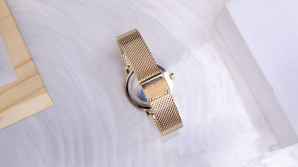 Movado 3600653 sở hữu mẫu dây đeo với thiết kế dạng lưới độc đáo và có giá trị thẩm mỹ rất cao. Chất dây được làm bằng thép không gỉ mạ PVD màu vàng gold, chi tiết này giúp cho dây đeo Movado 3600653 không chỉ sở hữu một thiết kế đẹp, mà còn được trang bị khả năng bền bỉ và mạnh mẽ theo thời gian. Đi cùng với đây lưới là khóa gập chắc chắn, được mạ màu vàng gold và khắc khắc chìm tên BST Movado Bold đầy tinh tế, hài hòa với tổng thể thiết kế của chiếc đồng hồ này.