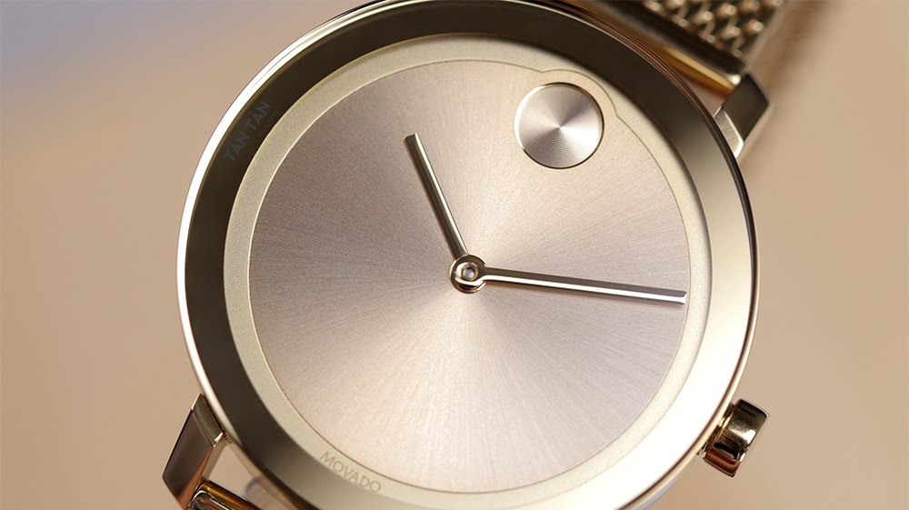 Thiết kế tinh giản tối đa không cọc số và chi tiết 1 chấm 2 kim mang tính nhận diện thương hiệu cao. Chấm tròn thương hiệu tại vị trí 12 giờ được hoàn thiện vân tròn đồng tâm với bộ 2 kim baton đơn giản được mạ PVD màu vàng gold hài hòa. Sự vắng mặt của kim giây giúp mặt số như ngưng đọng bởi sự dịch chuyển vô cùng khẽ khàng của bộ đôi kim chính. Ngoài ra, thông tin thương hiệu Movado được thể hiện nhỏ gọn tại vị trí 6 giờ, khiêm tốn và nhã nhặn nhưng vẫn khẳng định được giá trị đến từ thương hiệu lớn.