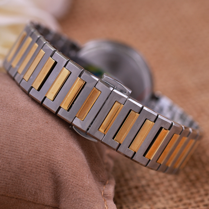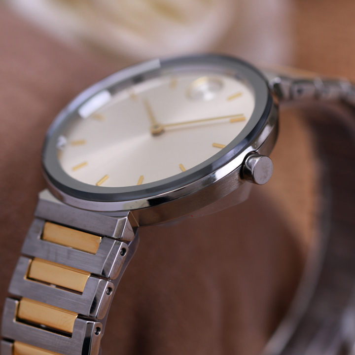 Toàn bộ phần vỏ và dây đều được làm từ thép không gỉ, mang lại cảm giác chắc chắn và độ sáng bóng cao. Kiểu dáng dây thanh mảnh, kết hợp hài hòa với mặt số tròn nhẹ nhàng, mang đến nét nữ tính nhưng vẫn toát lên sự mạnh mẽ và tự tin. Dưới ánh sáng, sắc beige của mặt đồng hồ kết hợp với ánh kim từ vỏ thép không gỉ tạo nên hiệu ứng ánh nhìn lấp lánh đầy tinh tế.