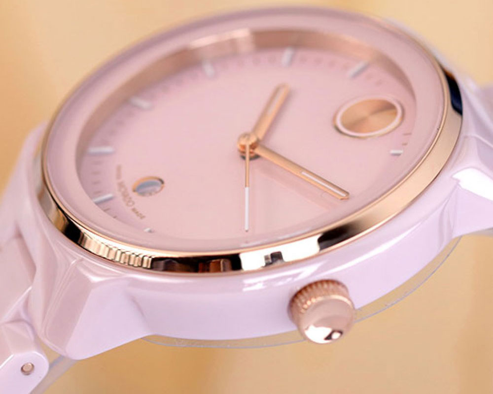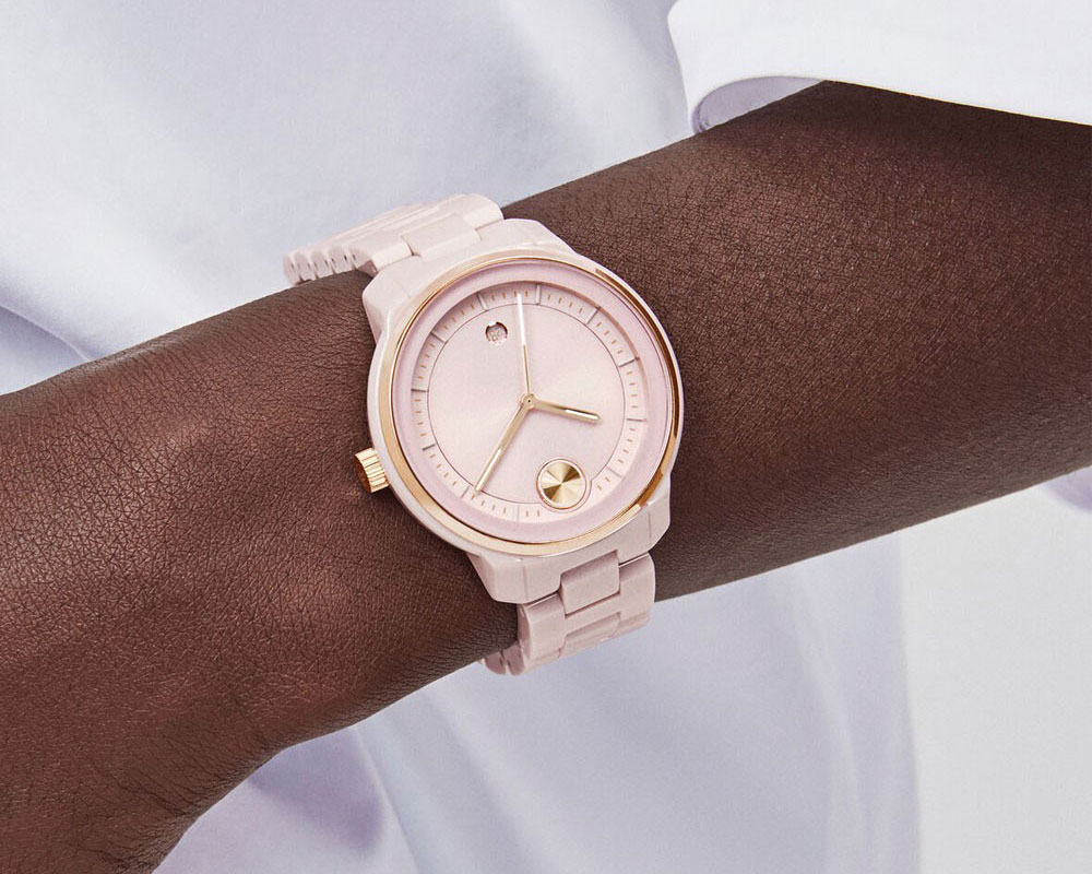 Movado 3600935 được “nâng cấp” với chất liệu Ceramic cho cả bộ vỏ và dây đeo H-link. Đây là chất liệu bền nhẹ hơn thép không gỉ nhiều với bề mặt luôn sáng bóng, sang trọng trên cổ tay của phái đẹp. Với màu hồng tổng thể thì đây là chiếc phụ kiện dành cho sự kiện đòi hỏi “dress code” hoay đơn giản là món trang sức quyến rũ trong các outfit của phái đẹp. Phía trên là niềng bezel thép mạ PVD màu vàng hồng nổi bật tạo điểm nhấn cho chiếc đồng hồ.