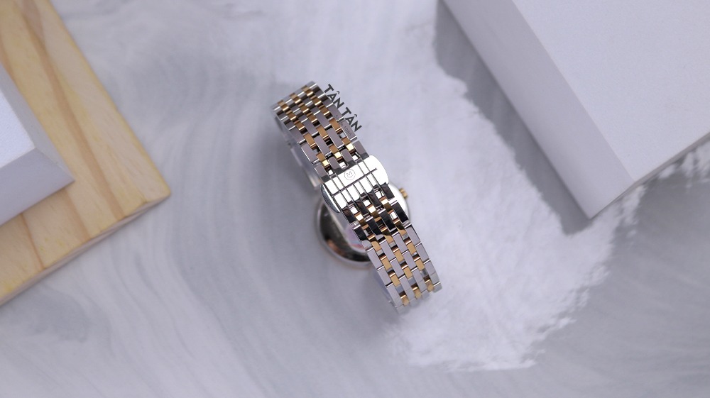 Thiết kế dây đeo bằng chất thép không gỉ với các liên kết dài hiện đại, sang trọng dành cho những quý cô yêu thích phong cách thanh lịch và nổi bật. Với thiết kế 7 mắt xích liên kết với nhau giúp cho dây đeo uyển chuyển và mềm mại, trên cổ tay xen kẽ màu vàng hồng-bạc tạo hiệu ứng màu demi thời thượng . Đi kèm với dây đeo này là khóa cân bằng gọn gàng với nút bấm tiện lợi dễ dàng đóng-mở giúp dây đeo chắc chắn, ôm trọn cổ tay của các cô nàng.