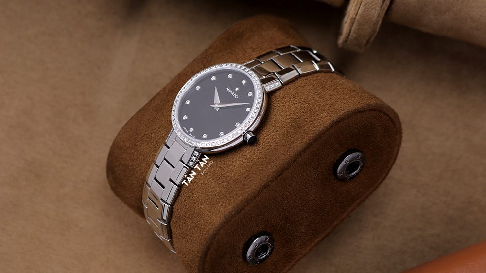 ✓ Mặt số màu đen đính 12 viên kim cương sang trọng vẫn giữ được nét đặc trưng quen thuộc của Movado.