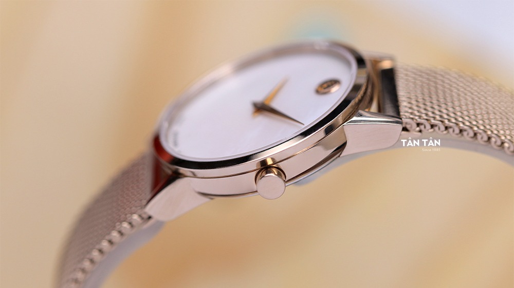 Movado 0607352 mang vẻ ngoài hấp dẫn với tông màu vàng hồng - “rose gold” cực sang trọng. Tổng thể đồng hồ được thiết kế rất đơn giản với bộ vỏ tròn trơn bóng, mặt số khảm xà cừ trắng mang đặc trưng “một chấm hai kim” của BST Museum Classic. Tất cả các chi tiết đều được chế tác tỉ mỉ làm cho chiếc đồng hồ nổi bật nhưng rất tinh tế, thanh lịch.
