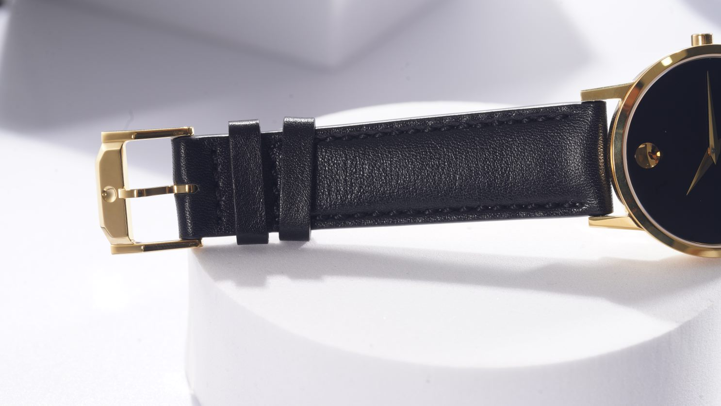Dây da bê màu đen mềm mại với khóa cài tiện lợi của Movado 0607584