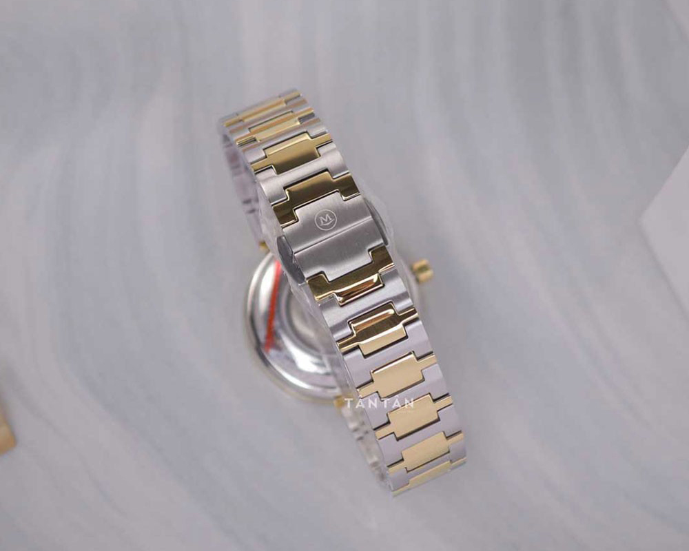 Dây đeo thép cũng thiết kế dạng H-link uyển chuyển, khác với những cách hoàn thiện trước các mắt dây giữa có được làm 2 thanh ngang giữa các chữ H mạ PVD màu vàng xen kẽ với bề mặt được đánh xước phay sang trọng, thẩm mỹ. Liền lạc cuối dây vẫn là khóa cân bằng gọn gàng, ôm tay. Ngoài ra, với độ chống nước ở mức 3ATM (tương đương áp suất ở độ sâu 30m nước) hỗ trợ rửa tay hoặc đi mưa mà không lo đồng hồ bị vô nước.