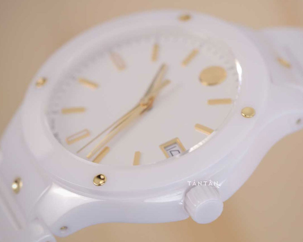 Dây đeo đồng hồ Movado 0607740 dạng H-link liên kết với nhau rất chắc chắn cũng được hoàn thiện từ chất liệu ceramic. Các chấm lõm mạ màu vàng gold được thiết kế sắc sảo và ấn tượng chạy dọc theo chiều dài dây đeo làm nên nét đặc trưng của mẫu đồng hồ cao cấp. Thiết kế chất liệu ceramic mát lạnh cùng sự trau chuốt kỹ lưỡng được đánh bóng và chải xước phay ở các đường liên kết giữa tạo cảm giác cực kỳ thanh lịch và sang trọng. Kết hợp cùng dây đeo là khóa cân bằng chắc chắn, tiện lợi giúp đồng hồ luôn ôm trọn cổ tay các quý cô.