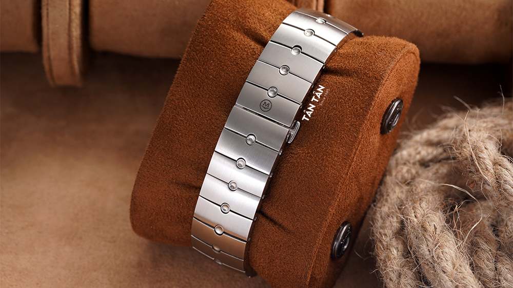 Dây đeo thép thiết kết liền lạc với chấm lõm dọc các khớp nối của dây đeo mang đến sự độc đáo, mới lạ